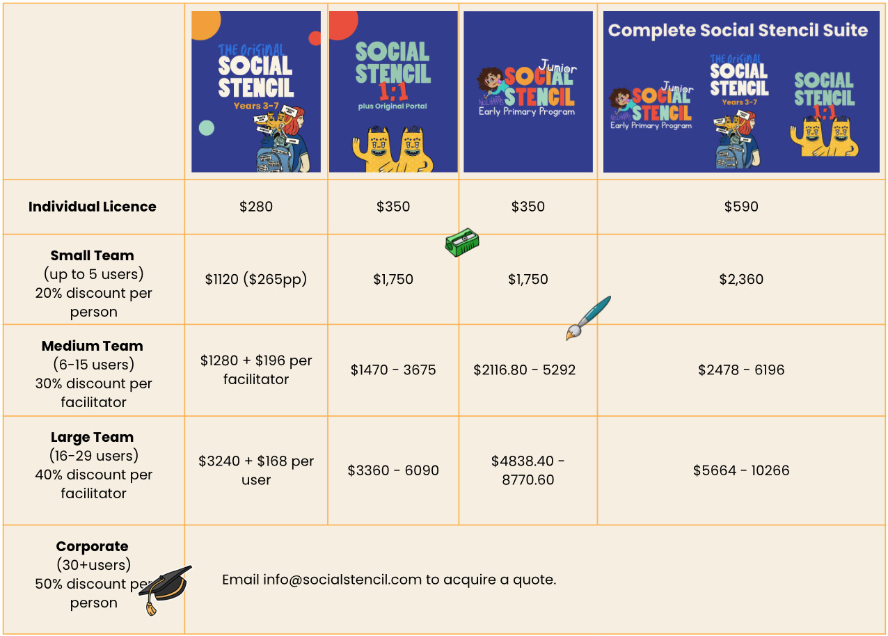 All prices are a 12-month licence to access and deliver the Social Stencil Program via our online portals. Portals include training videos, lesson plans and all downloadable PDF materials.